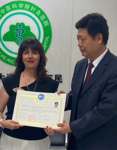 Formée pendant 5 ans en MTC, puis certifiée par la WFAS (World Fédération of Acupuncture and Moxibustion Societies) de Pékin. Cet organisme international travaille avec l’OMS (Organisation Mondiale de la Santé), afin de développer l’acupuncture-moxibustion pour améliorer la santé dans le monde, et de promouvoir la coopération et la recherche dans le domaine de la MTC.